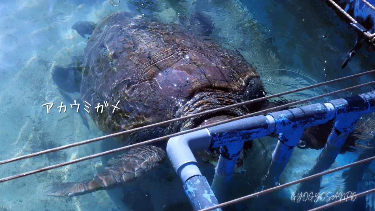 ウミガメプールでゆったりと泳ぐウミガメたちは、エサを食べるのがちょっと下手です。